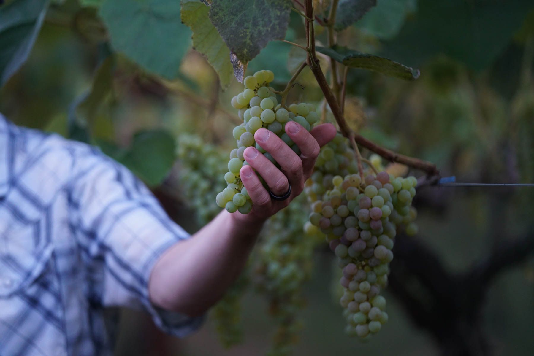 Our open-gable trellising is similar to traditional tendone (big tent) systems used in parts of Italy. In the summertime, the grape clusters hang below a lush canopy of green leaves, providing natural shade and airflow. Our Reliance grapes—a hybrid of Ontario and Suffolk Red varieties—thrive in this environment, producing fruit that’s ideal for both snacking and winemaking.